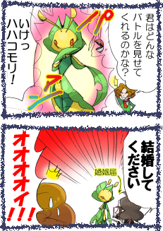 ハハコモリは攻撃強いですね・・・!ジャノビーのたたきつける連打&やどりきのタネで回復しつつ、なんとか勝利しました!時間5分くらいかかってしまいました・・・だが悔いはない